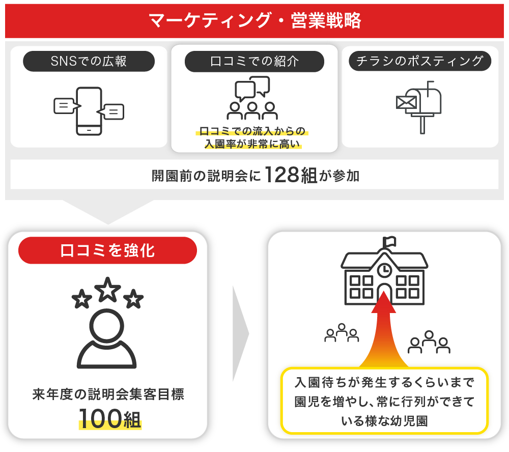 このマーケティング戦略には、25年間バディスポーツ幼児園で園の運営に携わってきた「ヒーロー幼児園」園長・田中の経験とノウハウが活かされています。