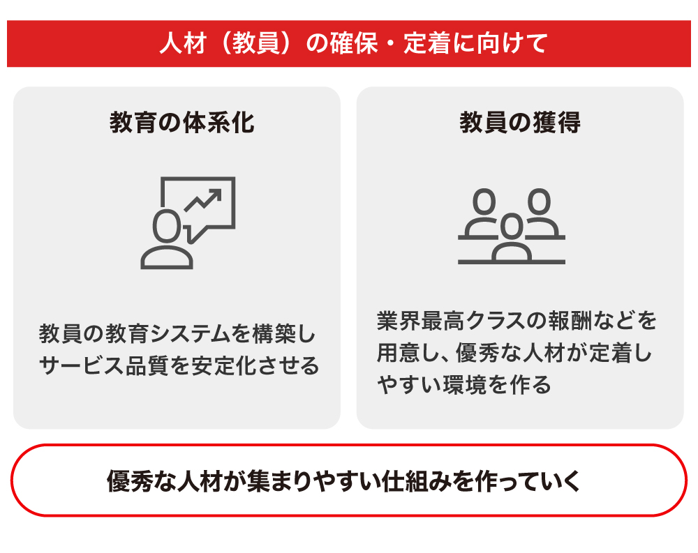 サービスクオリティが担保できないため、フランチャイズ展開は行いません。我々が提供するのは大量生産の製品ではなく、「教育」です。直営で人を育て、カリキュラムを洗練しながら、質の高い教育を提供していくことで事業を拡大させていく考えです。
