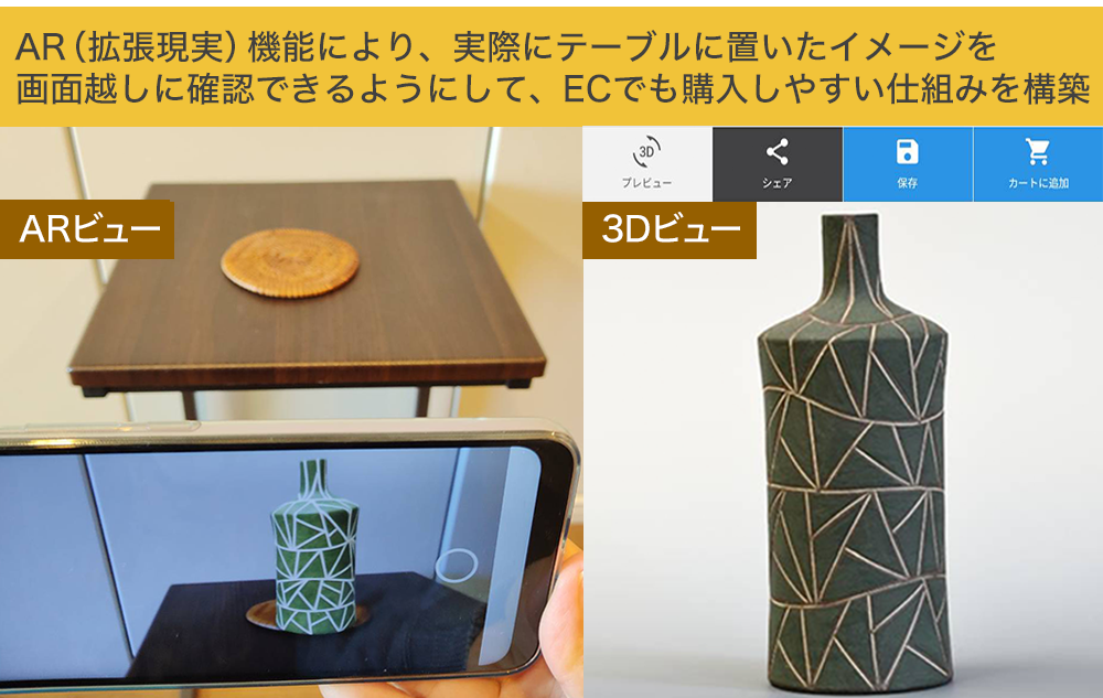 まず、製品を「産地」や「技法」など様々なジャンルや用途から選べるようにして見つけやすくしており、また、スマートフォンからであれば写真のみでなく3DビューやAR機能を活用して製品の全体像を確認することを可能にしています。