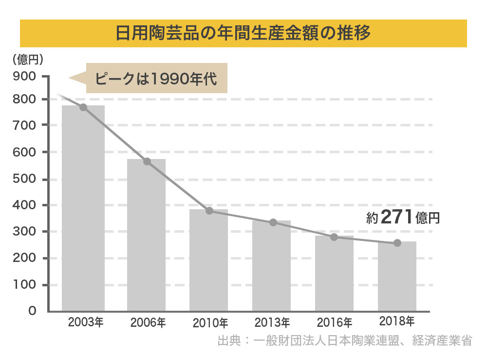 経済産業省が2019年に発表した「生産動態統計年報(資源・窯業・建材統計編)」によると、台所・食卓用品を扱う陶磁器産業の生産額は1990年代をピークに縮小を続け、2018年ではピーク時の2割程度の約271億円となっています。