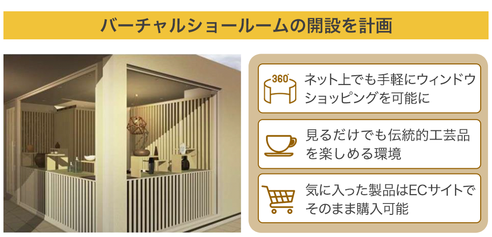 また、来年にはバーチャルショールームの開設も計画しています。これは、都内のショールームをオンライン上で忠実に再現し、ネット上でもウィンドウショッピングを可能にし、見ているだけでも楽しめるようなサービスにする計画です。世界中の人に日本の伝統的工芸品に触れてもらい、購入に繋げる機会にしたいと考えています。