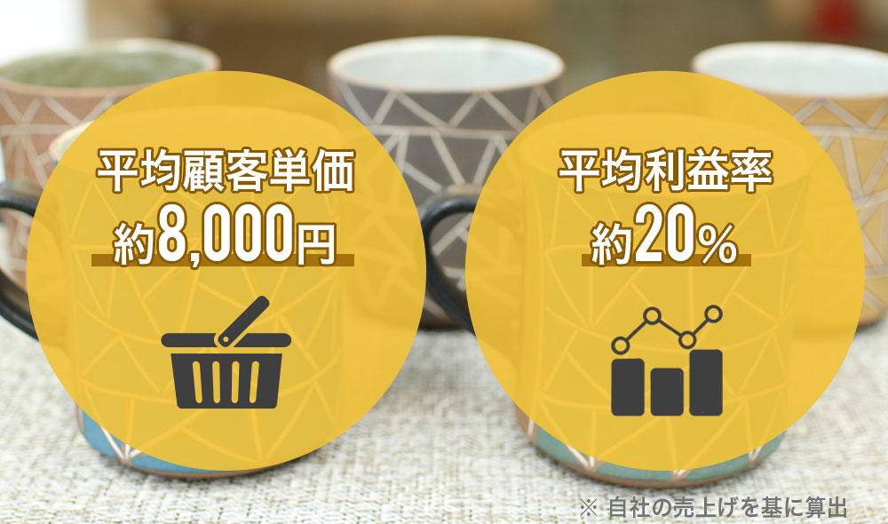 高価な製品を、店舗で直接製品を手にとって吟味していただくことで購入機会を創出しています。神田のショールームだけでも通常期は1日に約6,000人の方が店舗の前を通行し、一月に約120個のペースで陶磁器が購入されています。