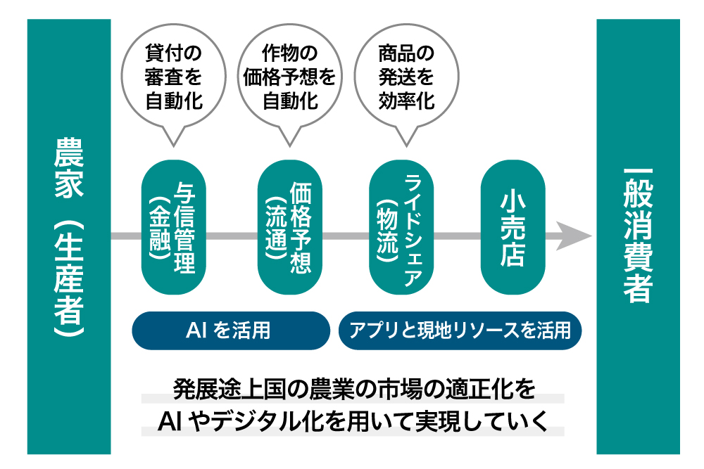 農家に対する資金の貸付や農作物の流通を担うには、与信管理や価格調査・予測を行う専門技術や人材、インフラが必要になりますが、途上国のビジネスではこれらのコストと利益が見合わないため、これらを人が行うことは難しかったのです。