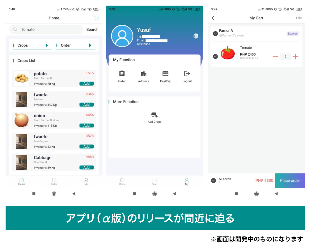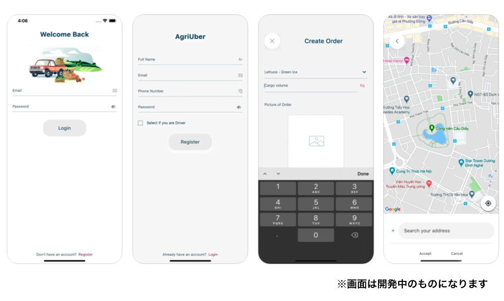 また、作物販売・購入もできるライドシェアアプリもα版が近日中に公開予定で、当アプリを活用していただくことで、発展途上国の農業の発展に貢献していきたいと考えています。