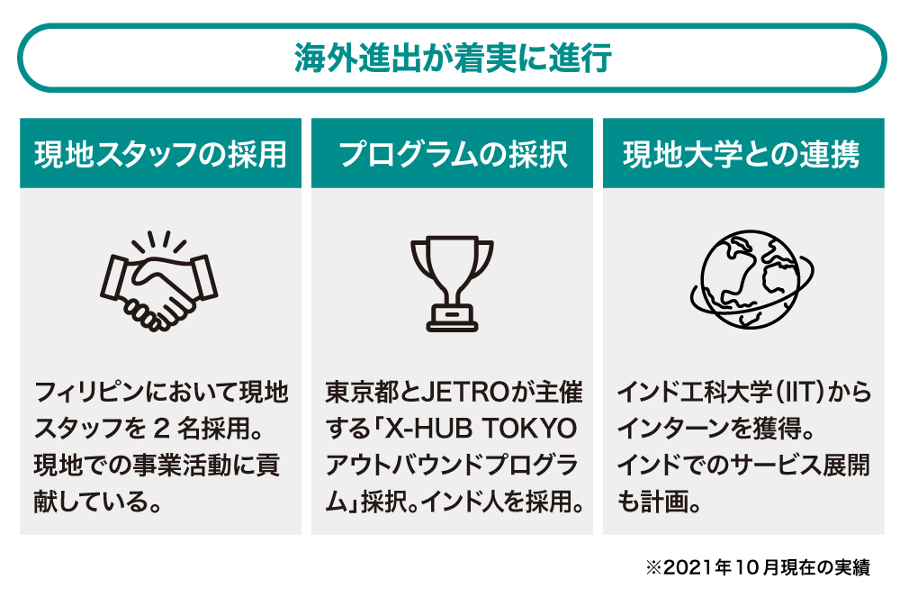 その他にも、東京都とJETRO(日本貿易振興機構)が主催する「X-HUB TOKYO アウトバウンドプログラム」に採択され、フィリピン始め東南アジア各国への展開の綿密な戦略を立てると共に、国際的なパートナーや投資家とのネットワーク作り・メディア戦略などを練っています。