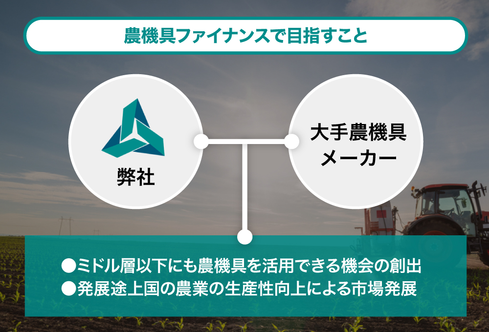 現在、大手農機具メーカーとともに、農機具ファイナンスをフィリピン向けに行っていく協議が進行しています。弊社の技術・ノウハウを活用しながら、ミドル層以下へのサービスの展開を目指します。