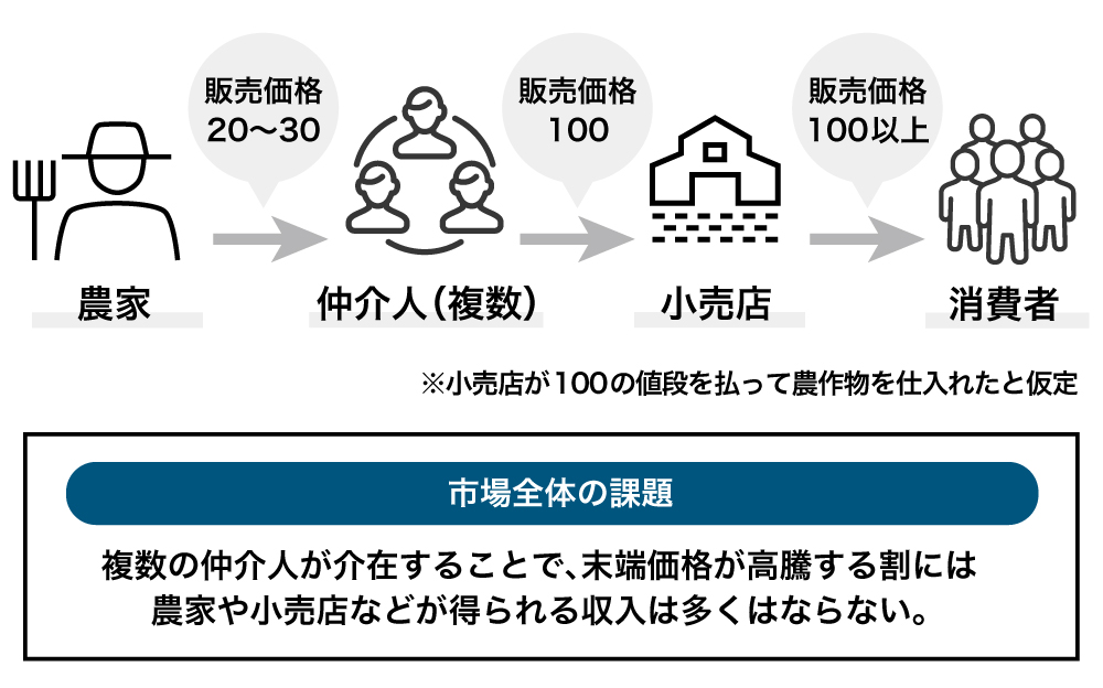 こういった状況から、小売店が仮に100の値段を払って農作物を仕入れていても、農家の手に渡るのは20~30程度です。
