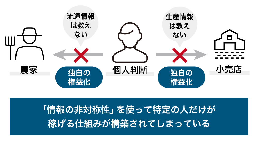 しかし、これらの流通を担う人々がもつ販路情報は、彼らの稼ぎにも繋がるため情報等は開示されず、結果、農家側は農作物の出荷・流通を他者に頼るしかありません。取引価格の情報も明かされないので、自分が手にする金額が小売価格に対して非常に少ないことや、小売店側が支払った手数料も農家自身は分かりません。