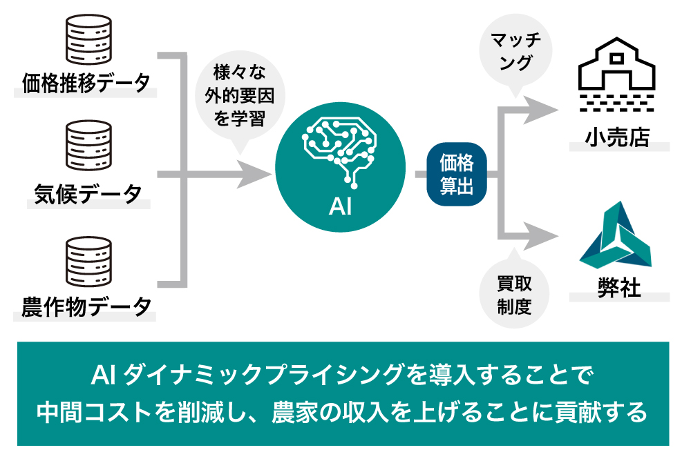 さらに、天候データやこれまでの価格推移データもAIに学習させることで、作物の価格予測にもAIを活用します(AIダイナミックプライシング)。この予測価格に基づいて弊社が農家から直接農作物を買い取ったり、適正価格で買い取ってくれる小売店とマッチングしたりといった、流通支援がデジタル上で可能になります。