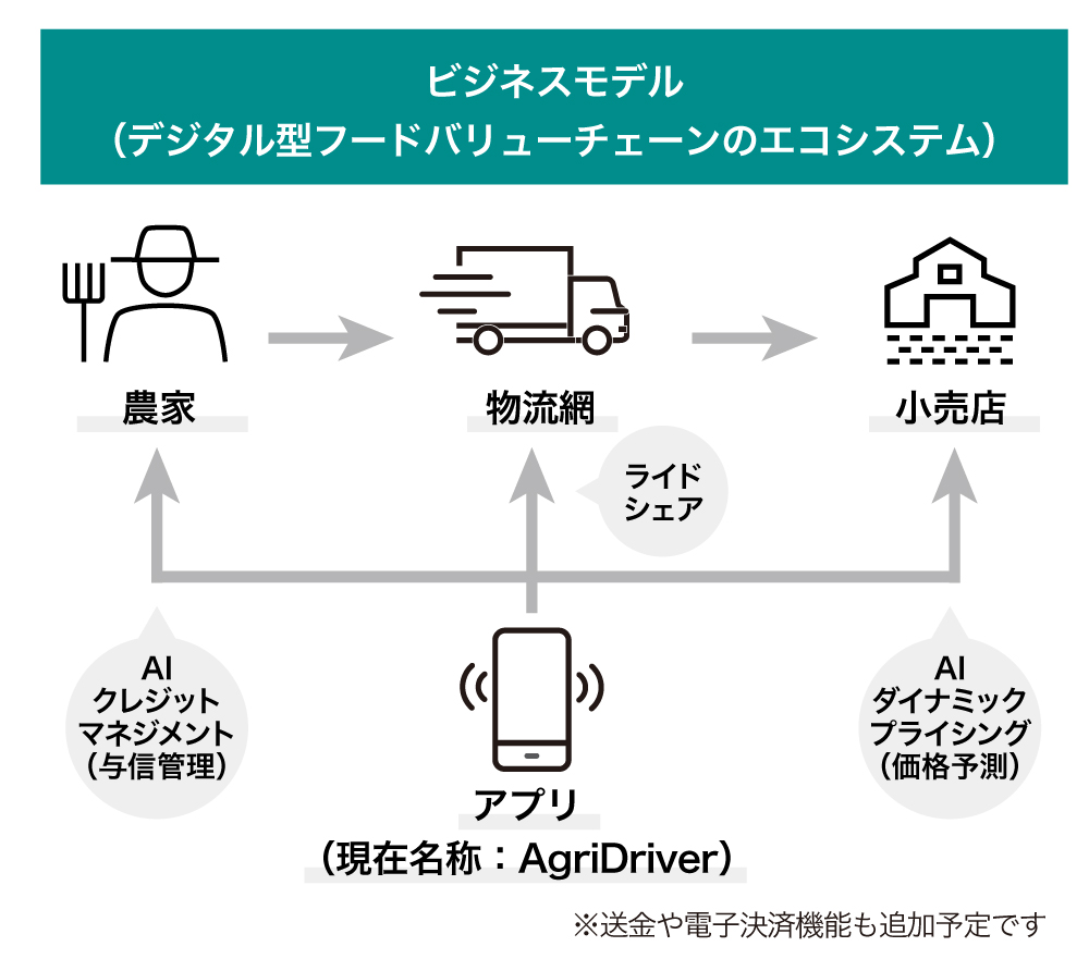 将来的には、当アプリにAIによる与信管理や価格予測機能も統合し、「融資の申し込み」から「農作物の買い取り依頼や小売店との交渉」、「ライドシェアによる輸送の手配」などをすべてアプリ上で管理したいと考えています。