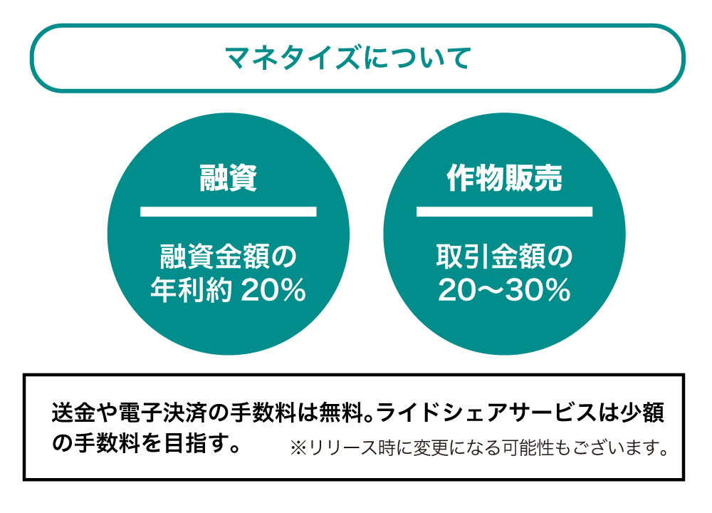 弊社のマネタイズポイントは、農家の方への融資の際の金利とAIダイナミックプライシングに基づいた作物の買い取りやマッチングの際の手数料です。