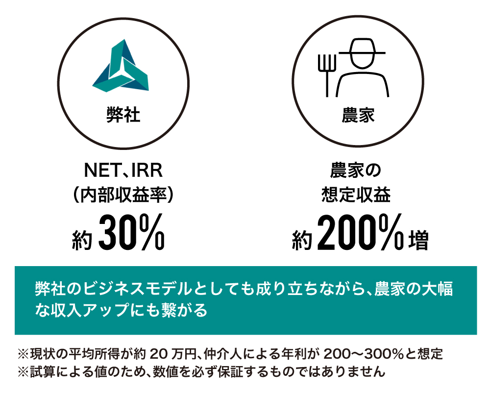 上記手数料を抑えても、融資金利と買い取り/マッチング手数料によるマネタイズでNET、IRR(内部収益率)は30%程度となる試算で、十分な利益を確保できると考えています。