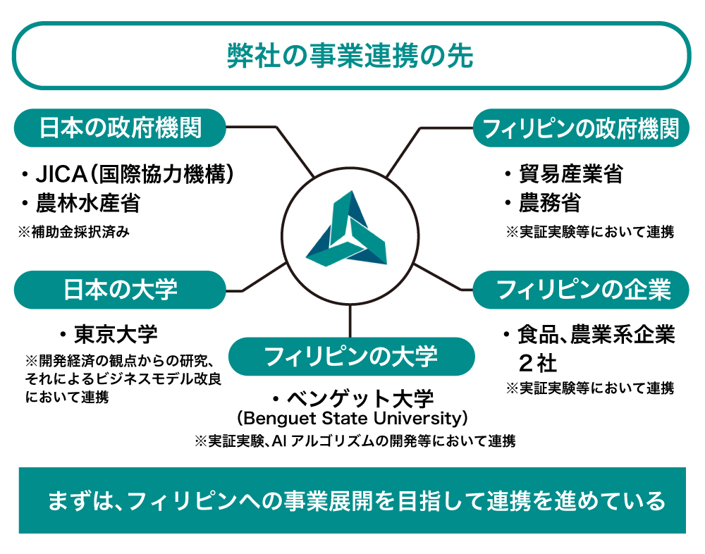 AIアルゴリズムの開発は自社で行っておりますが、ベンゲット大学(Benguet State University)や東京大学とも連携しています。引き続きこれらの協力先と連携し、ビジネスを展開していきます。