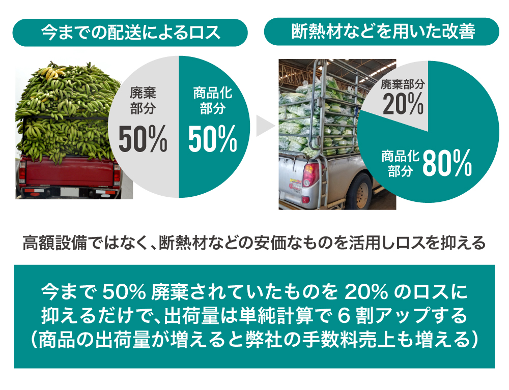 そこで弊社では、輸送環境を整備することでフードロスを解決するとともに、自社売上拡大のポイントでもある「作物の出荷量」を拡大することを目指しています。そのために、冷蔵機能のついた高価なトラックを導入するのではなく、安価な断熱材などを活用することで、費用対効果の最大化を目指します。