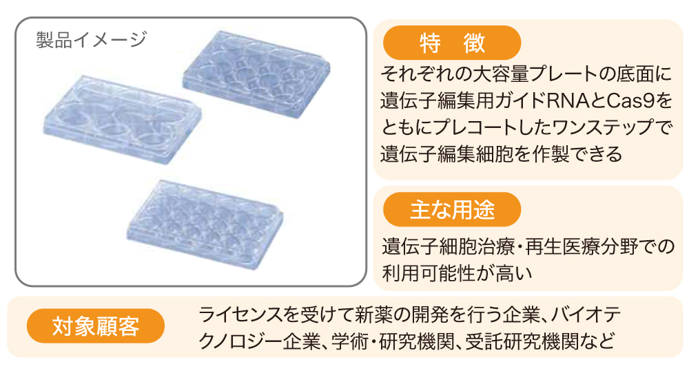 ãã®çµæã掻çšããåŒç€Ÿã§ã¯æ°ãã«ãéºäŒåç·šéãããããéçºããŸãããå補åã¯ãéºäŒåç·šéããããã¬ãŒãã®åºé¢ã«ãéºäŒåç·šéçšã¬ã€ãRNAãšCas9ããã¬ã³ãŒãã£ã³ã°ããããšã§ãåŸæ¥ãšã¯ç°ãªãã¯ã³ã¹ãããã§ç°¡äŸ¿ã«éºäŒåç·šé现èãäœè£œã§ãã補åã§ãã