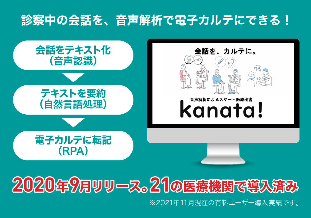 ãkanata!ãã¯èšºå¯å®€ã§ã®å»åž«ãšæ£è ã®äŒè©±ãé³å£°èªèã«ããããã¹ãåããè§£æã«ããå¿ èŠãªèŠçŽ ãæœåºããŠé»åã«ã«ãã«èªåå ¥åã§ãããµãŒãã¹ã§ãã2020幎9æã«ãªãªãŒã¹ããçŸåš21ã®å»çæ©é¢ã§å°å ¥ãããŠããŸãã
