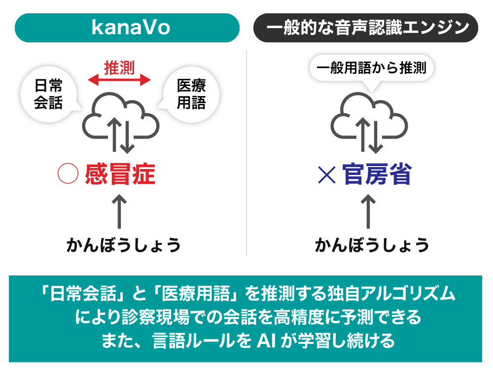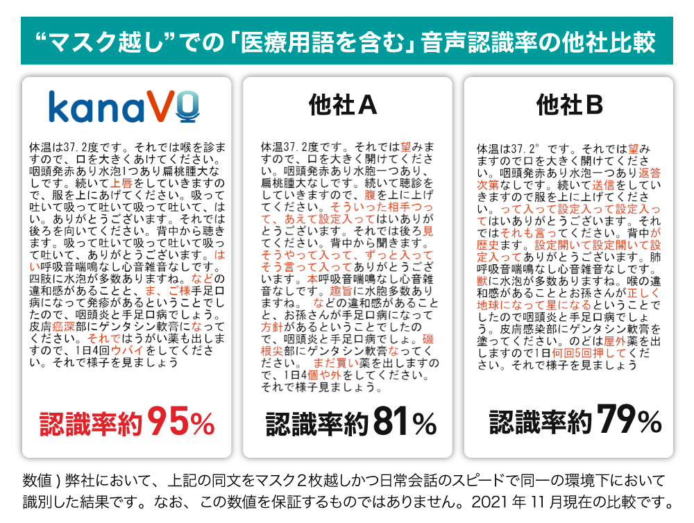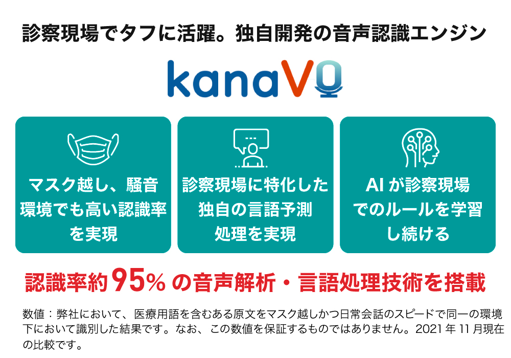 以前のバージョンの「kanata!」では、他社製の音声認識エンジンを使用してきましたが、利用者からの「精度が十分でない」という声を受けて独自に開発した音声認識エンジンが「kanaVo」です。「kanaVo」は診察室という空間の特性に合わせた細やかなチューニングによって、マスクをした状態でも約95%の認識率を実現し、現在、β版をリリース済みで、2022年に製品版のリリースを行う予定です(数値:他社製品との比較調査より)。