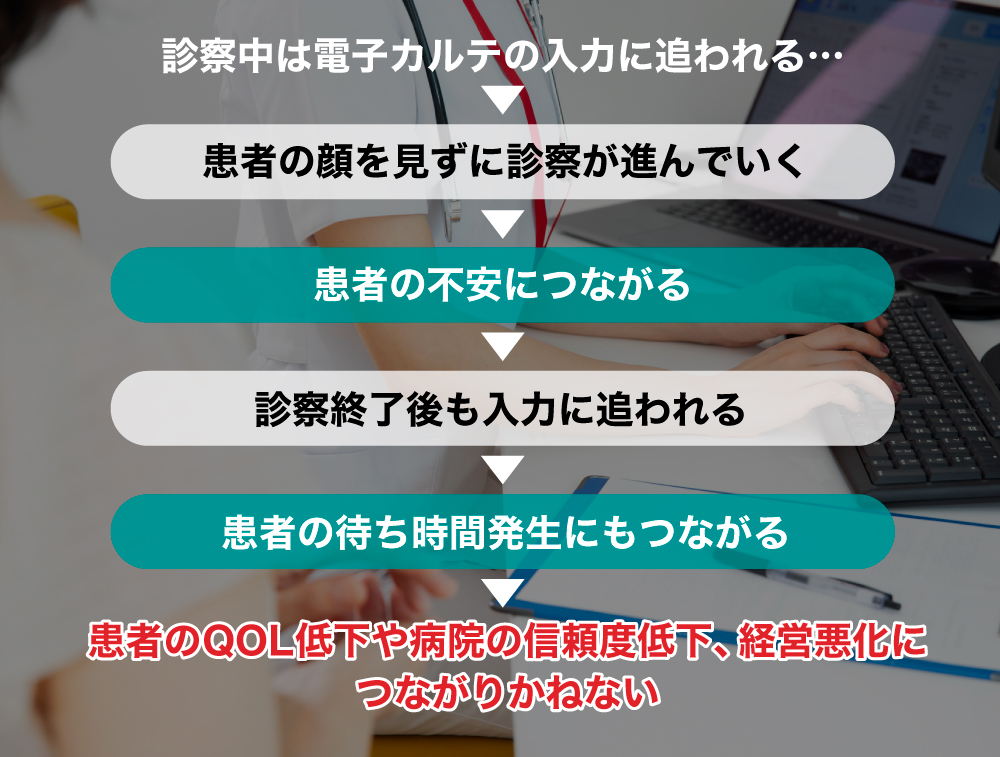 実は、患者ではなくPC画面を見ている医師は、会話の内容や診察結果、治療計画等を電子カルテに懸命に入力している可能性があります。また、診察中に入力できなかった場合、患者が退出した後に会話内容を思い出しながら入力作業に追われることになります。それが、次の患者が呼ばれるまでの空白の正体です。