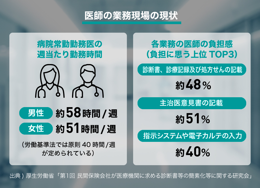 å»çæ å ±åŠã®èª¿æ»ã§ã¯ãå»åž«ã1æ¥ã®ãã¡é»åã«ã«ãå ¥åãå»çææžïŒèšºææžã玹ä»ç¶çïŒã®äœæã«è²»ããæéã®å¹³åã¯2æéãããã«è¶ ããŠããŸããé»åã«ã«ãã«å ¥åããªããŠã¯ãªããªãæ å ±éã¯å¹Žã å¢ããŠããããããçŸåšã§ã¯ããã«è² æ ãå¢ããŠããŸãã