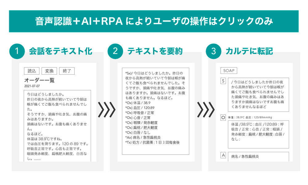 スマート医療秘書サービス「kanata!」は、「1.音声認識による会話のテキスト化」「2.自然言語処理によるテキストの要約(サマライズ)」「3.RPA(Robotic Process Automation:業務自動化ツール)による自動入力」の3ステップで電子カルテ入力作業の負担を大幅に軽減します。