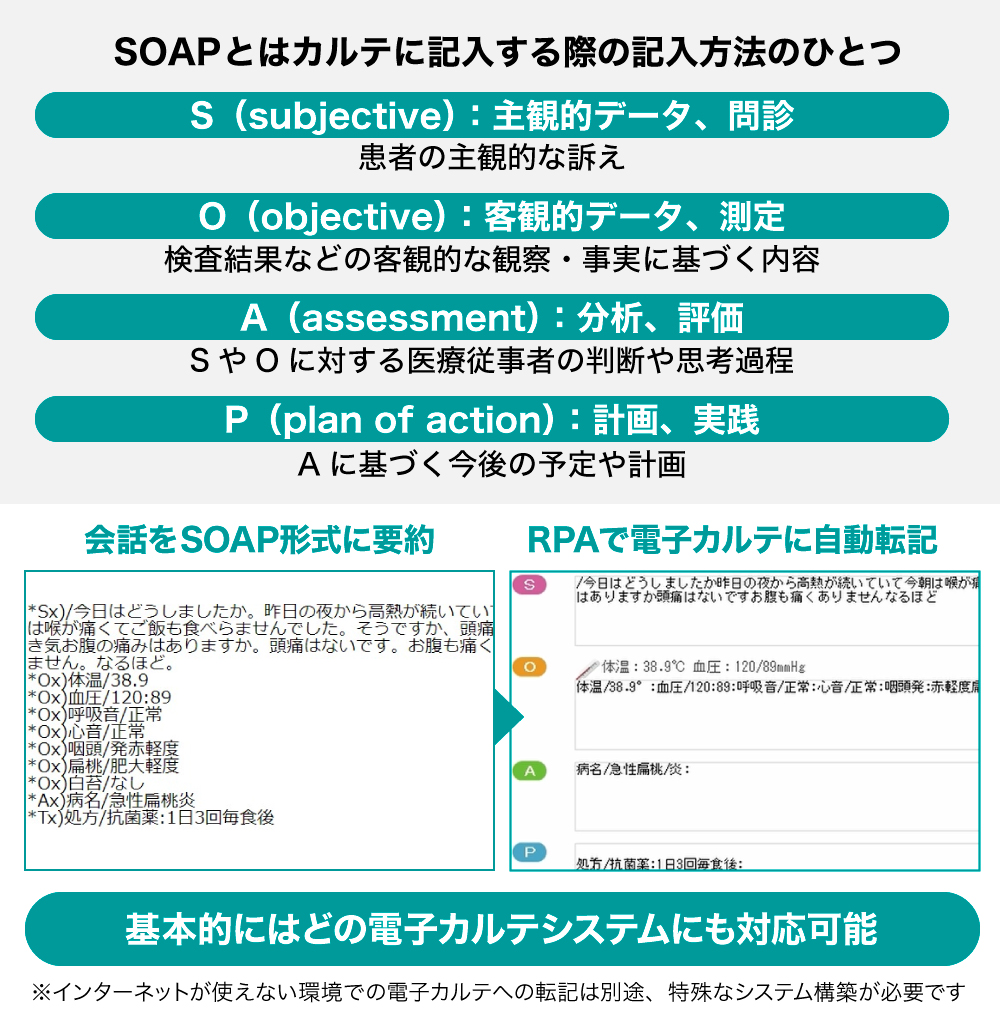 音声認識エンジンによって高精度でテキスト化された会話内容は、自然言語処理によって必要な箇所を抜き出して要約され、電子カルテに入力するためのSOAP形式に整えられます。