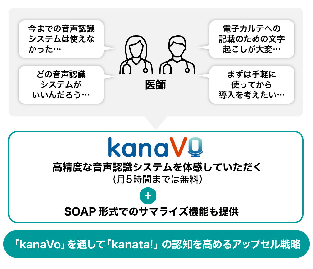 具体的には、「kanaVo」の高い音声認識エンジンを、医療現場で使える精度の高い音声認識サービスを探しているユーザーや、音声認識に限界を感じて一度は諦めてしまったユーザーに対して訴求します。そして、音声のテキスト化と同時にSOAP形式でのサマライズ機能も提供するので、単なる音声認識だけではない付加価値も感じてもらうことができます。