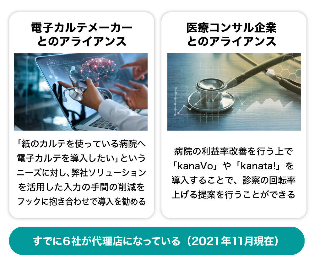 まず、紙のカルテからの置き換えを推進したい電子カルテメーカーと提携し、「kanaVo」で入力の負担を軽減できることをフックに訴求することで、両社のサービスの販売促進につなげていきます。既に代理店4社とも契約済みです。