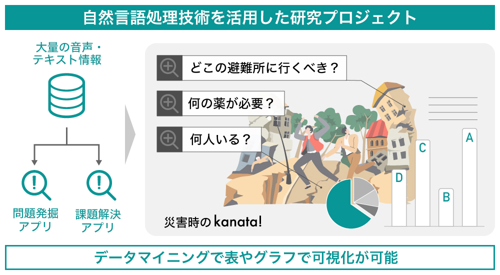 テキストのサマライズに使用している自然言語処理技術を応用することで、大量のデータの中から必要な情報を取り出すデータマイニングが可能になります。これにより、例えば災害時に飛び交う大量の情報の中から「どこの避難所に」「何の薬を必要としている人が」「何人いるか」を把握し、表やグラフで可視化することが可能だと考えています。