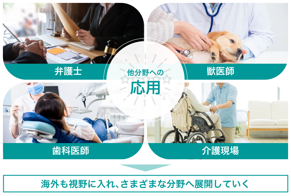 さらに、本サービスを医療以外にも販売していくことを目指します。なぜなら、要約機能搭載音声認識サービスはあらゆる職業人の役に立つと考えているからです。既に、歯科医、獣医、介護事業者、弁護士、教育関係者等からも、お問合わせを頂いています。