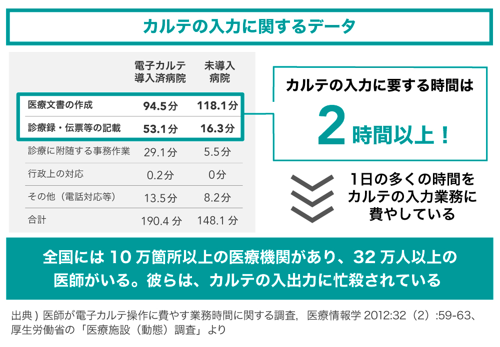 医療情報学の調査では、医師が1日のうち電子カルテ入力や医療文書(診断書や紹介状等)の作成に費やす時間の平均は2時間をゆうに超えています。電子カルテに入力しなくてはならない情報量は年々増えてもいるため、現在ではさらに負担が増えています。