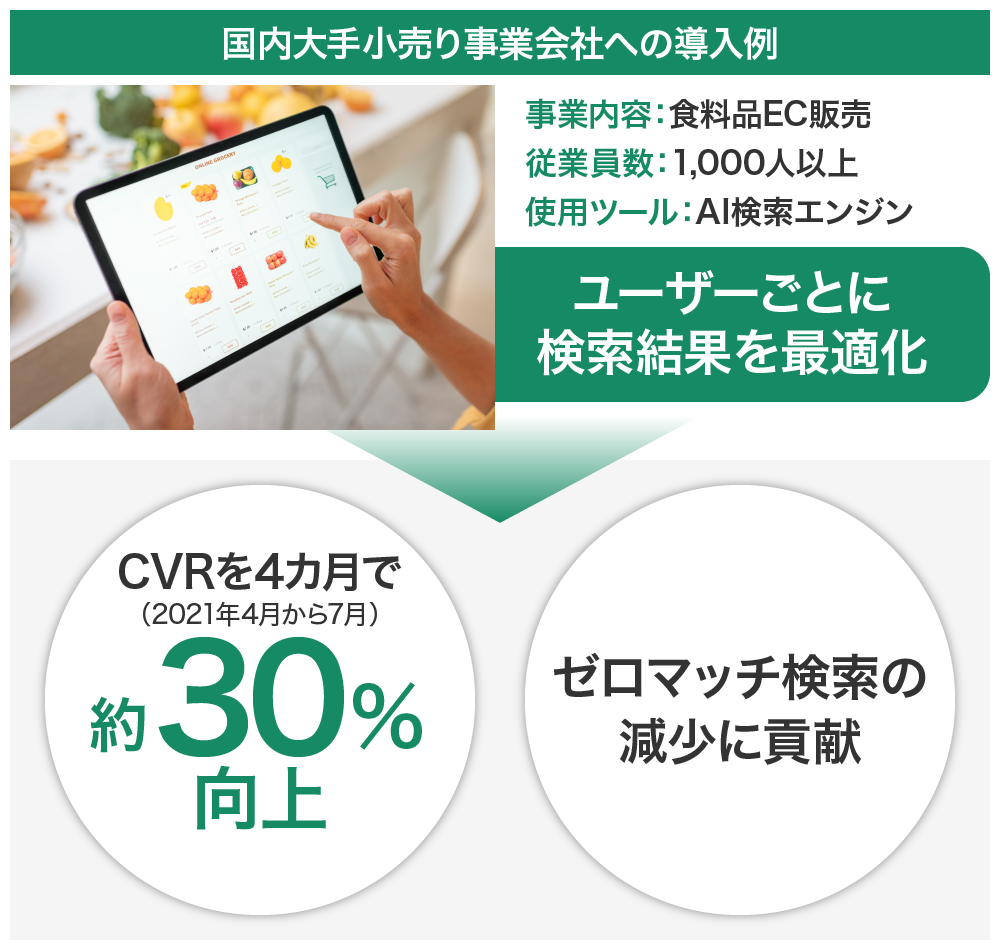 既に、国内小売大手が手掛けるECサイトに導入いただきました。ユーザーごとに最適化された検索結果を表示することでEC体験を向上させ、CVR(コンバージョン率:目的ページにアクセスしてきたユーザーのうち、どのくらいコンバージョンに至ったのかを示す指標)について2021年4月の約40%から同年7月には約70%と4か月で約30%の向上を実現しています。