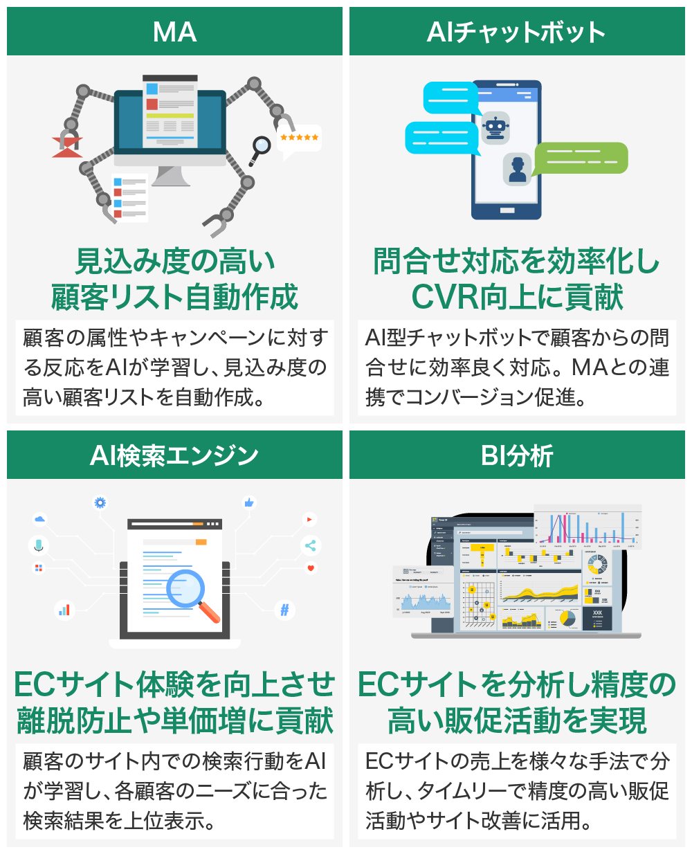 さらに、お客様からの問合せ対応を効率化する「AIチャットボット」に加え、ECサイトでの売上からトレンドや課題を分析する「BI(Business Intelligence)分析ツール」を追加開発し、これまでのMAツールと連携させることで顧客獲得の精度向上とコスト削減に貢献していきます。