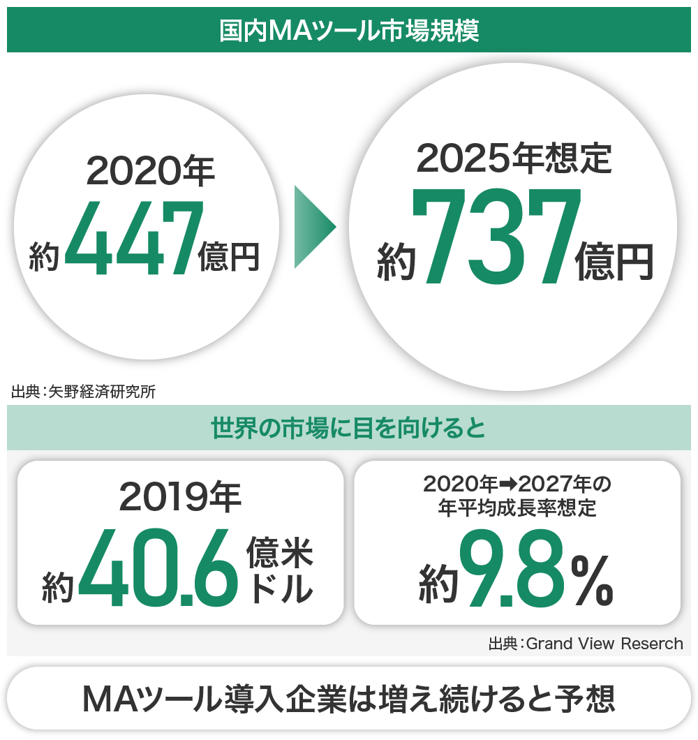 コロナ禍でDX(デジタルトランスフォーメーション)が課題となる中、総務や経理などのバックヤード部門だけではなくマーケティング業務も「生産性向上」や「業務効率化」が求められています。マーケティング業務の自動化を提供するMA市場の伸びがそれを物語っています。