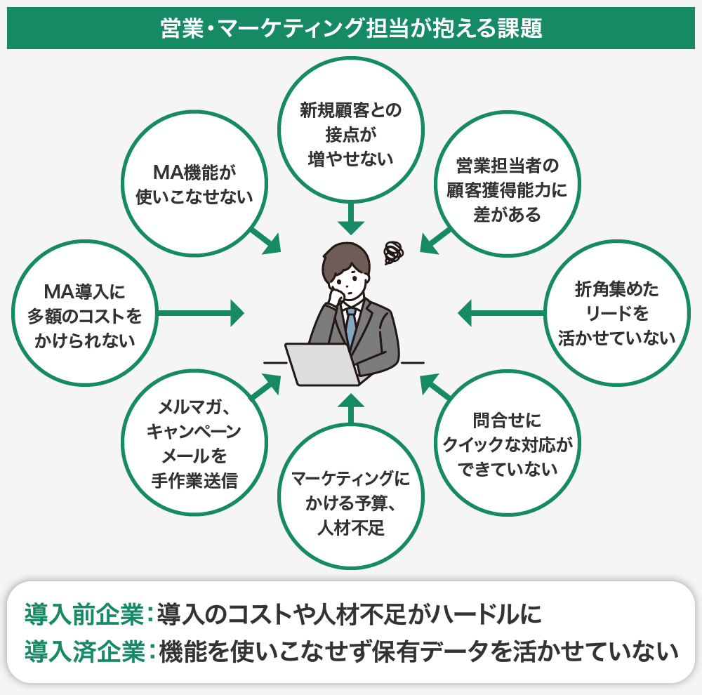 MAは営業支援、顧客管理を目的としたSFA(営業支援システム)やCRM(顧客関係管理)とは異なり、見込み客の育成と選別のためのプロセスを自動化していくツールです。マーケティングの専属部署を設けていない企業では、キャンペーン設定や結果分析など、見込み客の反応をスコアリングしたり、評価していくための業務を営業が自身で行なわざるを得ないケースが少なくなく、その負担は大きいのです。
