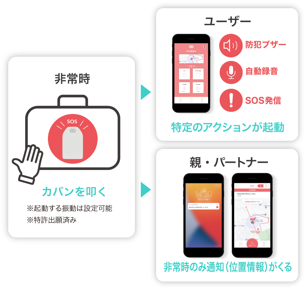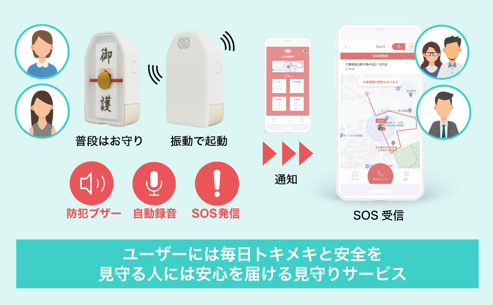 å°çšã¢ããªã§ããŠãŒã¶ãŒãšç·æ¥é£çµ¡å ïŒä¿è·è ãããŒãããŒãªã©ïŒããªã³ã¯ãããŠããŸãããæ¢åã®èŠå®ããµãŒãã¹ã®ããã«GPSæ å ±ãåžžã«ç·æ¥é£çµ¡å ã«éãããä»çµã¿ã¯æ¡çšããŠããŸãããéåžžæã®ã¿èµ·åããŠäœçœ®æ å ±ãéç¥ããããã«ããããšã§ããåžžã«å± å Žæãç¥ãããã®ã¯å«ããšããè¥ã女æ§ã®å¿çé¢ã«ãé æ ®ããŸããã