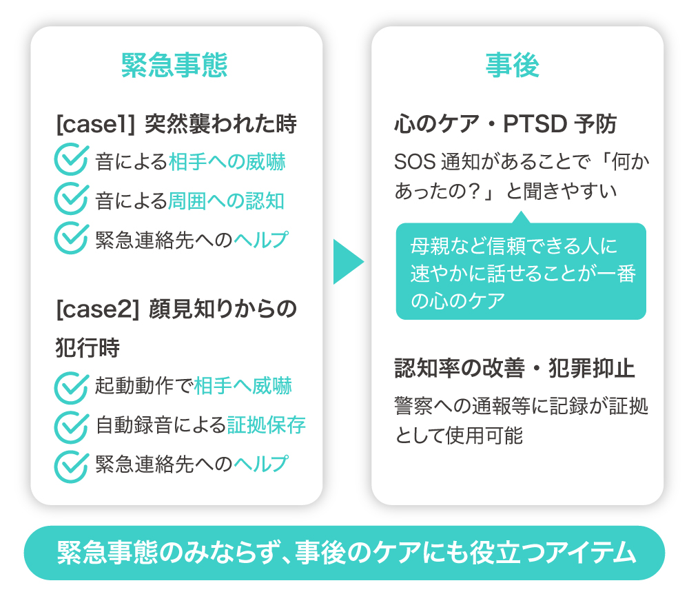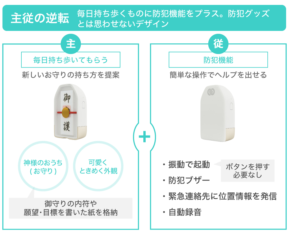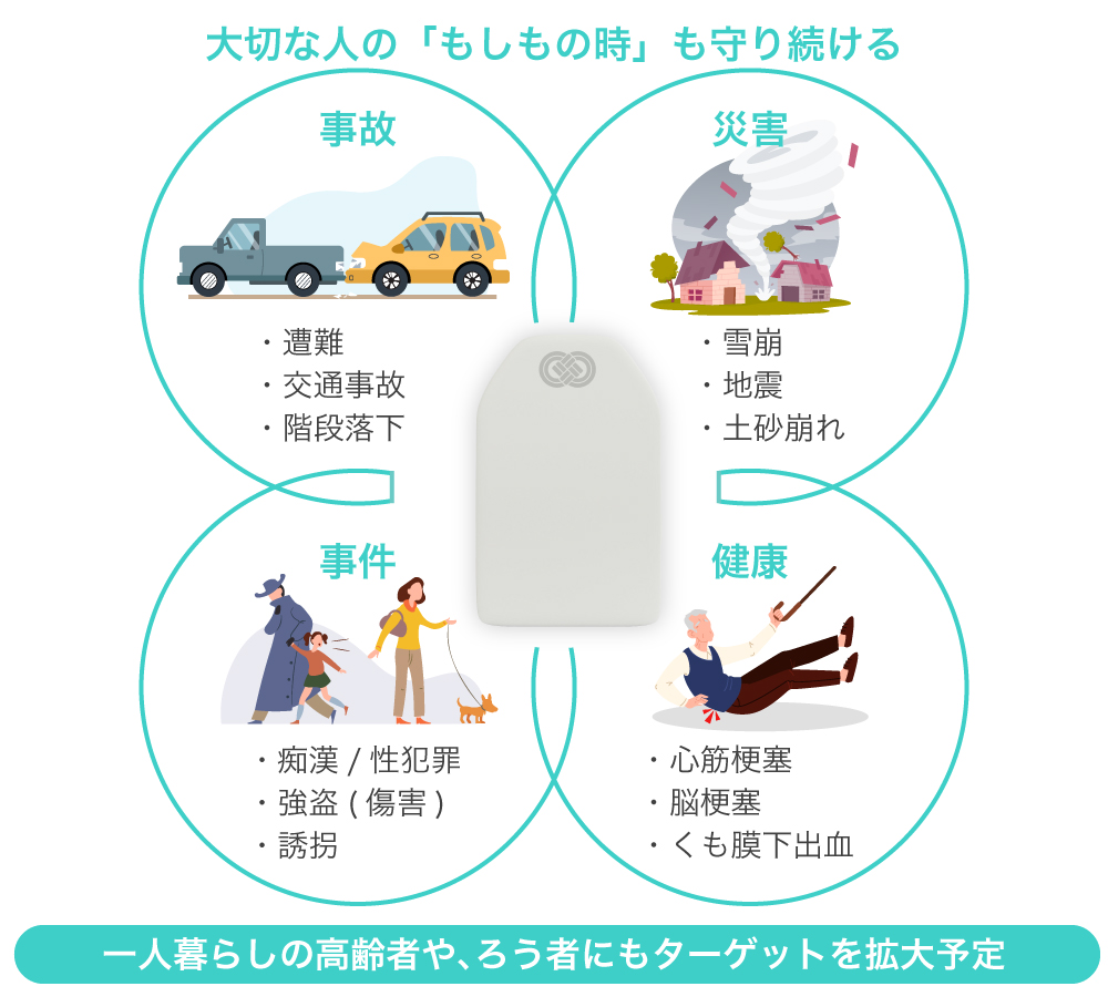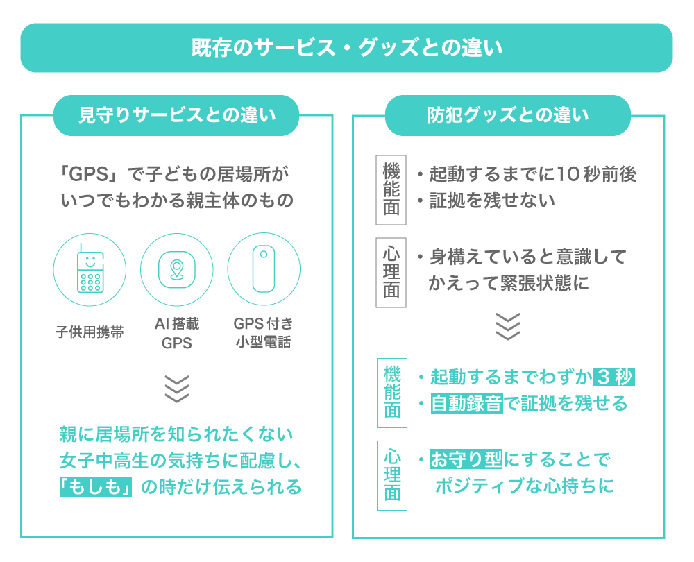 å°åŠçåãGPSä»ããããºæºåž¯ãé²ç¯ãã¶ãŒãªã©ã®æ¢åã®é¡äŒŒååã«å¯Ÿããæ¬ãããã¯ãã¯ãããã解決ã§ããŠããªãç¹ãåæããæ®æ®µããæã¡æ©ããããªãããããã®æã ãSOSéç¥ãå±ããªã©ãäžé«çã»20代ã®å¥³æ§ã®å¿çã«åŸ¹åºçã«å¯ãæ·»ããååéçºãè¡ã£ãŠããŸããã