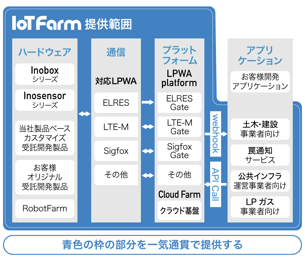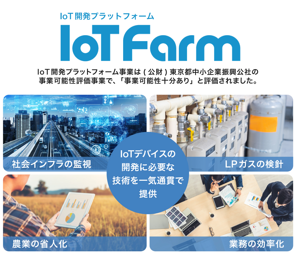 弊社は、IoTデバイスの開発、通信、制御を1つのプラットフォームで行うために弊社が開発したIoT開発プラットフォームの仕組み「IoT Farm(アイオーティーファーム)」の提供、また、当プラットフォームを活用したIoTサービスの開発・提供を行なっています。