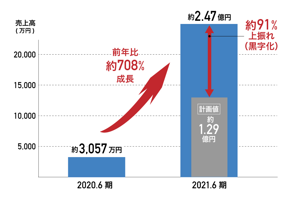 そして、これによりIoT機器の出荷が始まり、売上が立ち始めています。結果、前期である2021年6月期では約2.47億円の売上で着地し、事業計画比約91%増、前々期比約708%の売上高成長率を実現しました。