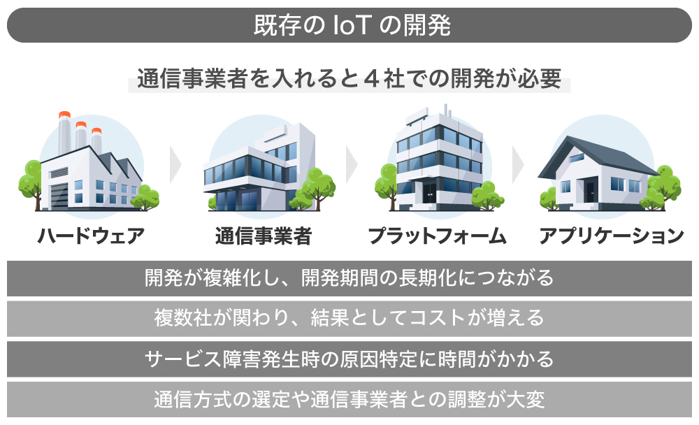 しかし、IoTデバイスの開発にはハードウェア、通信、プラットフォーム、アプリケーションなど様々な事業者が携わることで、開発が長期化したり、コストが大きくなったりといった問題が発生していました。