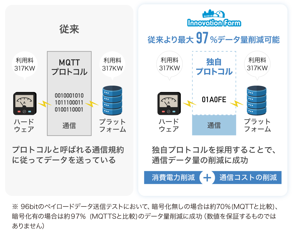 弊社は、LPWAの中でもLTE-M通信(LPWAの一種)の方式において独自の通信プロトコルを開発しており、従来の通信より最大約97%のデータ量を削減することが可能です。これにより、パケット代を抑えられたり、消費電力を抑えられるといったメリットを提供することができます。