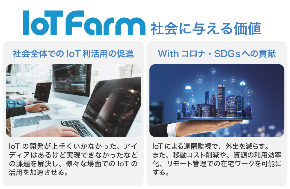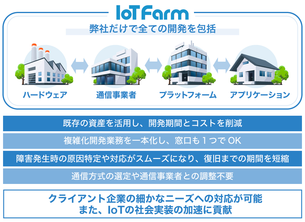 弊社の「IoT Farm」を活用することで、IoTデバイスの開発から運用監視サービスまで一気通貫で提供することができ、今までのIoTデバイスの開発の課題を解決するだけでなく、クライアント企業の細かなニーズへの対応、また、IoTの社会実装の加速に貢献することが可能です。