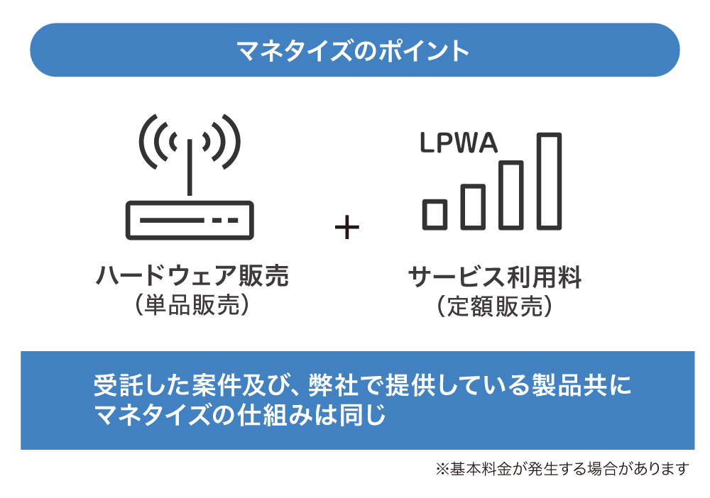 その際の各種案件では、ハードウェアの販売(単品販売)および、サービスの利用料(定額販売)が発生し、こちらが弊社のマネタイズのポイントになります。また、案件によっては基本利用料が発生する場合があります。