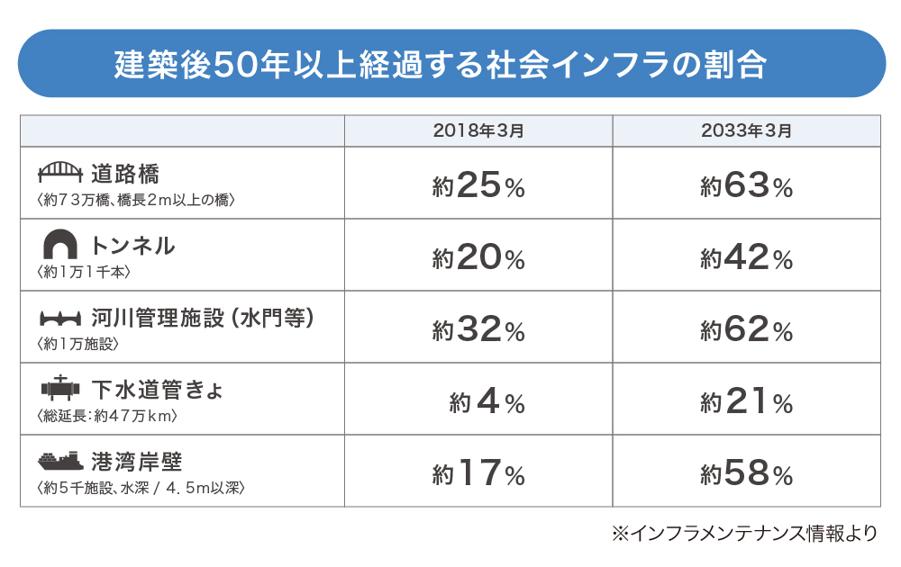 現在、世の中には橋や道路、鉄橋など様々な社会インフラがありますが、建築後50年以上が経過する社会インフラの割合は今後、さらに増加することから、IoTによる監視の仕組みが早急に必要になります。