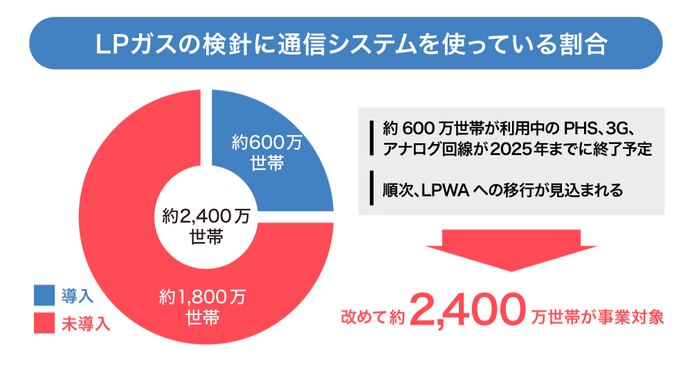 また、現在、弊社が進めているLPガス検針の案件においても、約2,400万世帯でLPガスが使われているにもかかわらず、過疎や高齢化により、ガス検針などに人的・物理的な課題が生まれている地域がたくさんあります(数値:資源エネルギー庁発表)。