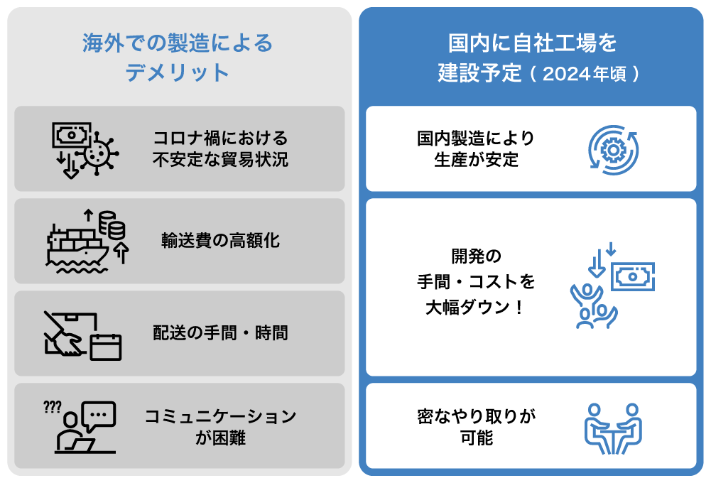 そこで、2024年ごろを目処に、国内にて自社工場を設けることを計画しています。それにより、IoTデバイスの開発にかかる手間とコストを大幅にカットすることができ、より、安定した供給、安定した経営ができると考えています。