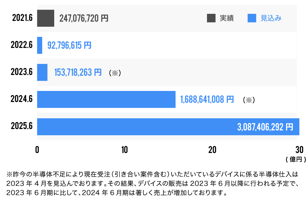 この半導体の確保が現在は難しくなっているため、2022年6月期および2023年6月期はデバイスの製造が追いつかないと想定しており、事業計画上は売上が2021年6月期より大幅に下回る計画を策定しています。