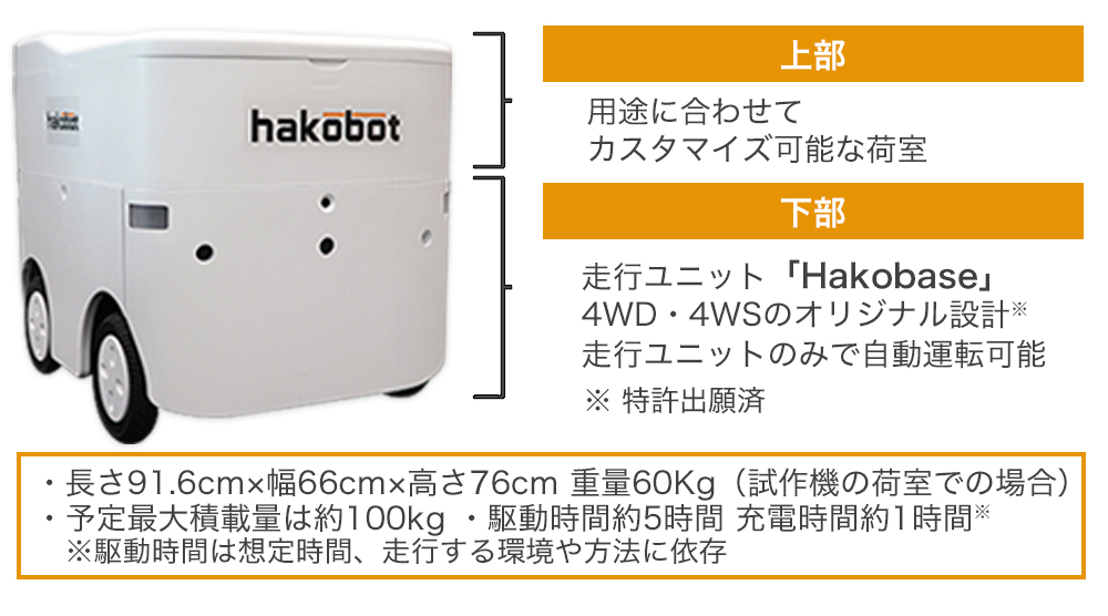 (弊社の配送ロボットは、ロボット下部の走行ユニット「Hakobase」とロボット上部の弊社オリジナル「荷室ユニット」を合わせたものになります。)