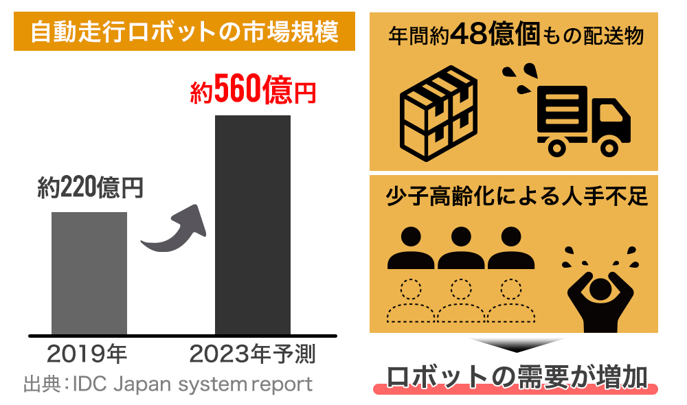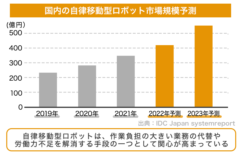 矢野経済研究所によると、販売またはリースされる自律移動型ロボットの国内市場規模は、2023年には年間50億円を超えると予想され、今後も成長が期待されます。