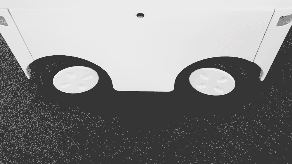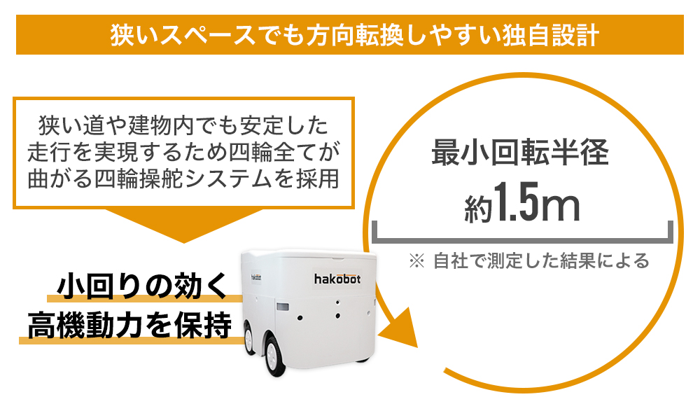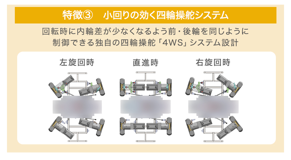 走行ユニットは内輪差が少なくなるよう、前・後輪を同じように制御できる独自の四輪操舵「4WS」を設計しました。車体デザインをコンパクトにすることで、最小回転半径1.5m以下を実現しています。