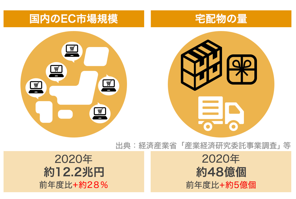国内のEC市場規模は、2020年が前年度比+約28%の約12.2兆円と、年々拡大し続けています。それにともない、宅配便の取扱個数も増加傾向にあり、2020年では前年度比+約5億個の約48億個にも至ります(出典:経済産業省)。